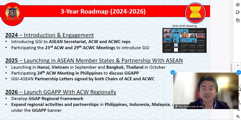 Shin Koyamada, Board Chairman of GGI, participated online and delivered a presentation and proposal to distinguished participants, including San Lwin, Deputy Secretary-General of the ASEAN Secretariat; Ermelita Valdeavilla, Committee Chair and Chairperson of the Philippine Commission on Women (PCW); and ACW representatives from all 11 ASEAN Member States.