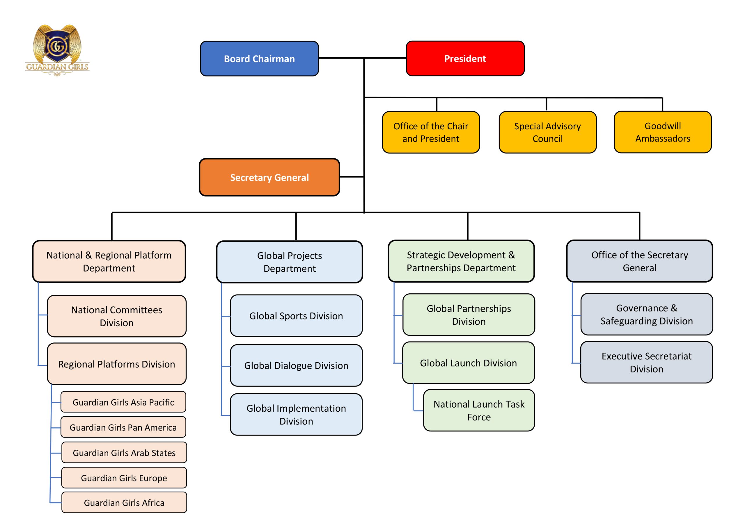 GGI is organized to ensure strong global governance, effective coordination, and nationally led implementation. Strategic oversight is provided by the Executive Board, while the Global Secretariat manages global leadership, standards, and coordination. Guardian Girls National Committees (GGNCs), formally recognized by GGI in each country, serve as the national implementing bodies. Regional and sub-regional structures function solely as coordination mechanisms to support collaboration, capacity building, and expansion worldwide.